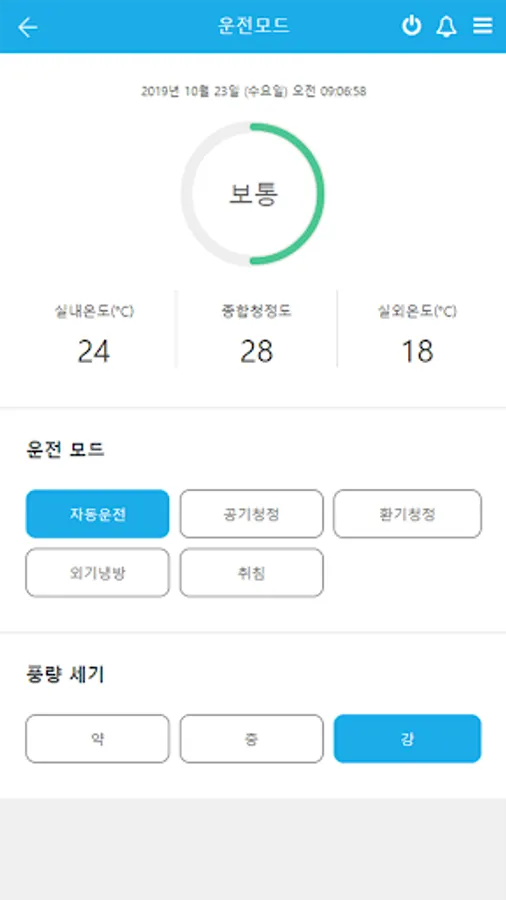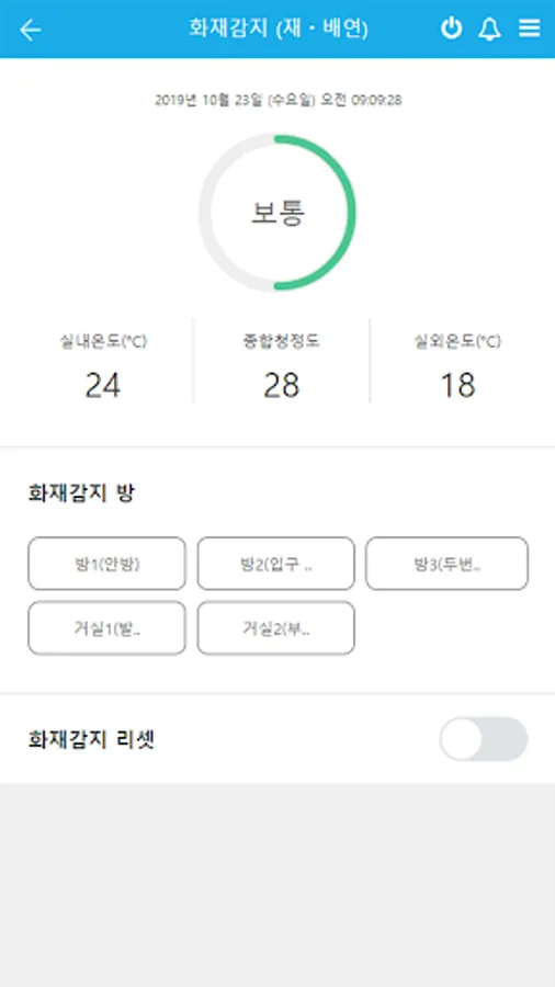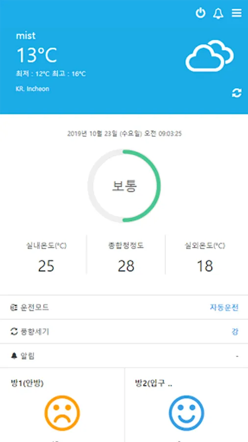 각 방마다 설치 된 전동디퓨져의 PM 2.5 먼지센서를 통해 공기청정도를 표시하고, 오염된 방을 선택하여 공기청정 및 다양한 기능을 실행합니다.