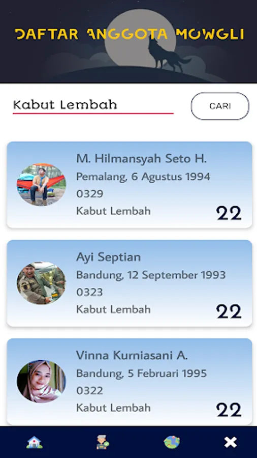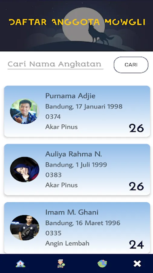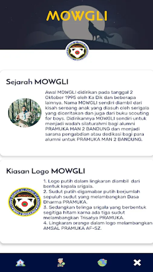 This application contains a database list of MOWGLI members (Senior Corps for SCAMPLE Ambitions MAN 2 BANDUNG). In addition, we can review MOWGLI's history and figures of speech as well as knowing MOWGLI Social Media.