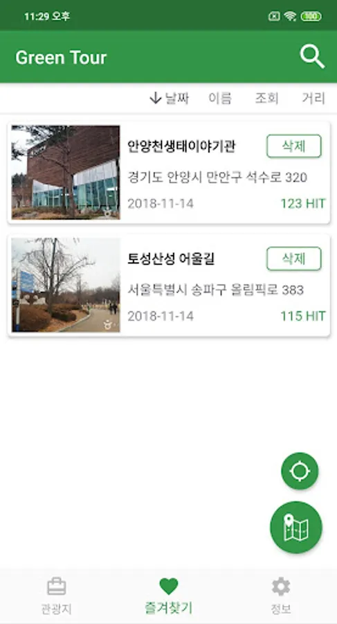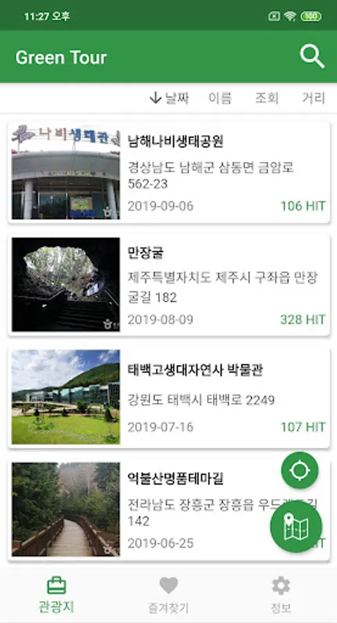 ● Ecotourism destinations can be easily sorted by date, name, number of views and distance.