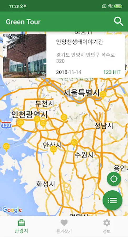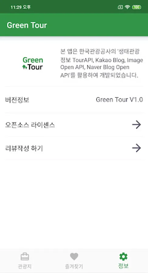 Green Tour The Green Tour app uses the Korea Tourism Organization API to service domestic ecotourism information.