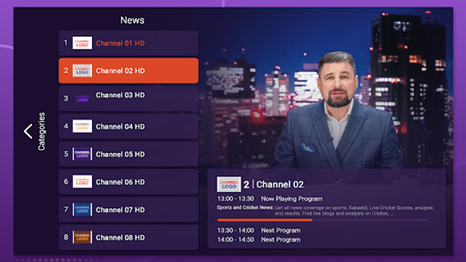 IPTV Purple Lite you can watch your own list of TV channels. Mark favorites to the channels you watch the most and you can access the list of your favorite ones.