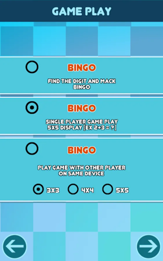 ✔ Multi-Player : Play BINGO the other player on same device with 3*3, 4*4 or 5*5 grid.
