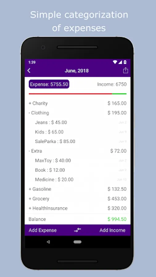 The personal finance app with a minimalist design. Purple Ledger has been designed to be simple and fast with a text based input mechanism at its core. No drop down menus or complicated wizards, just enter your categories and expenses in one go and let the app do the magic for you. It’s as simple as that. We have included a budget compare feature to enable you to track your daily expenses and equip you to make the best decisions. Happy Savings!