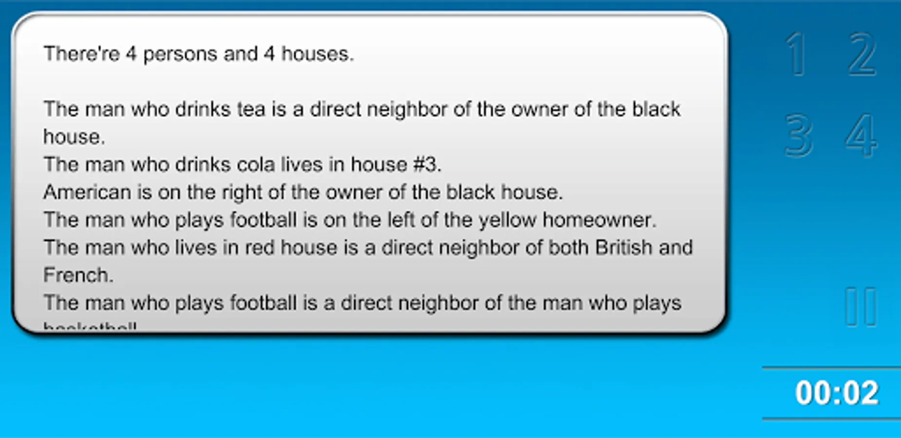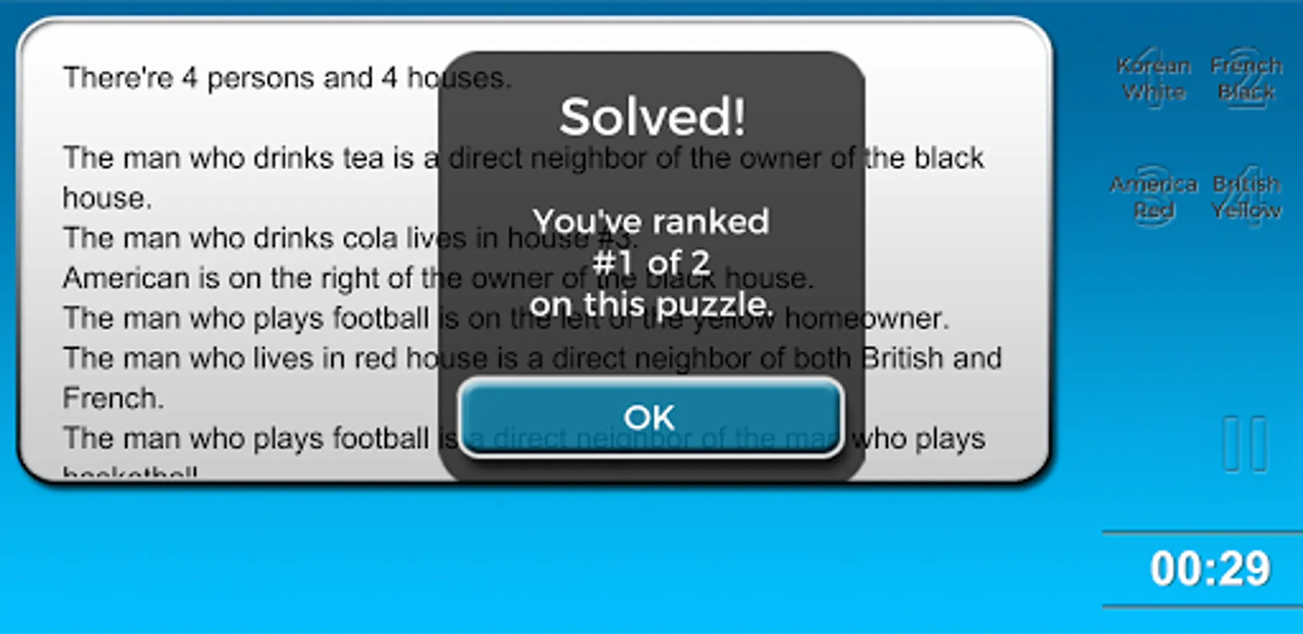 Zebra Puzzle ,aka Einstein's puzzle, is a logic puzzle.