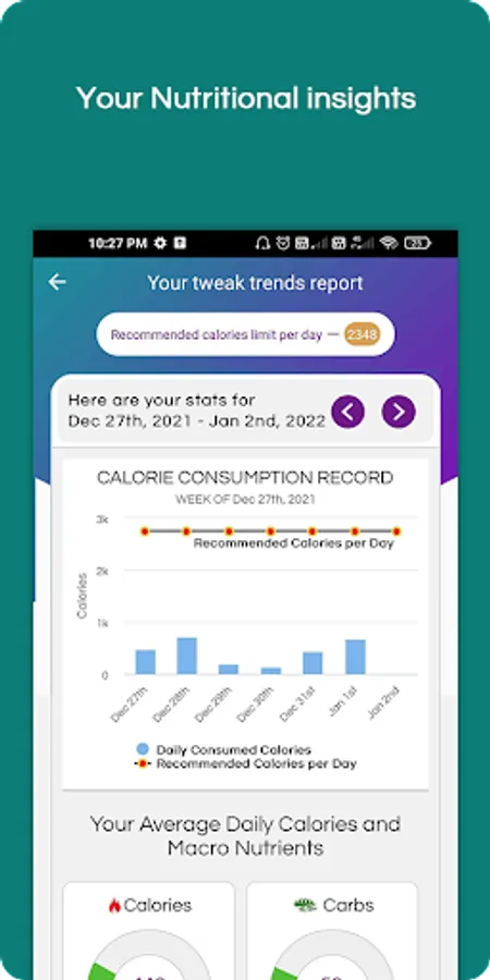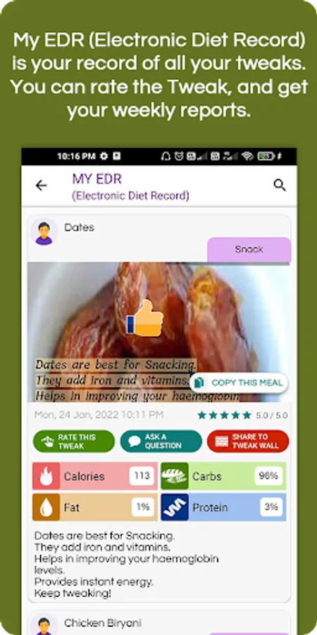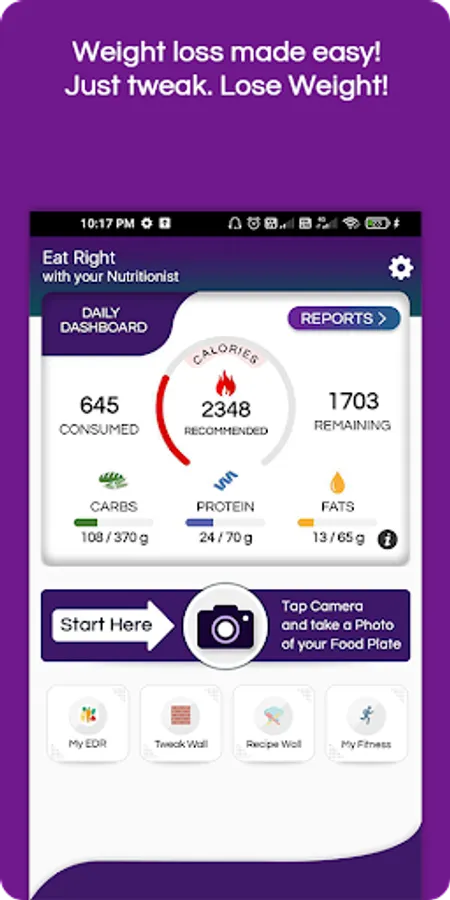 4. ‘MY EDR’ (Electronic Diet Report) will have your ‘Food and Tweak’ Diary. ‘Reports’ will have your weekly report of %Carb, %Protein, %Fat consumed with advise and recommendation from the nutritionist for the coming week