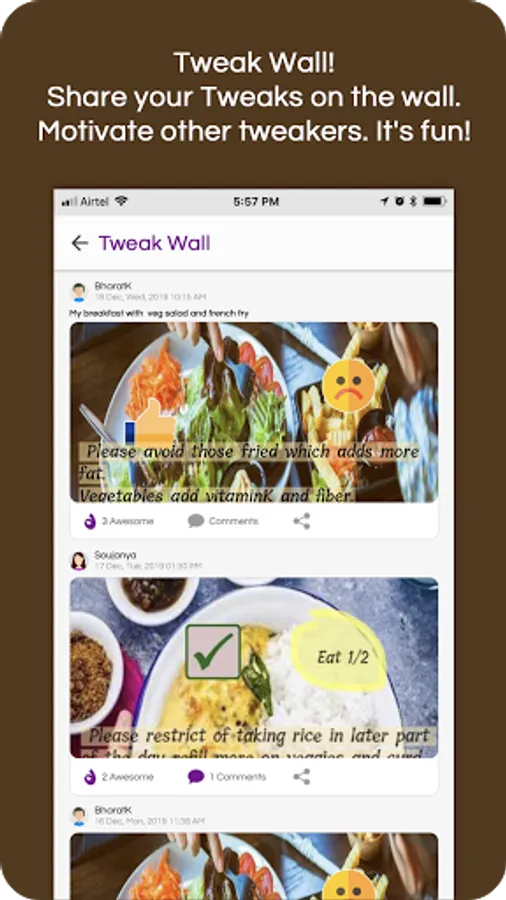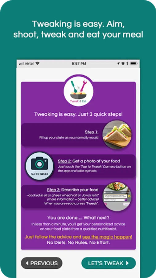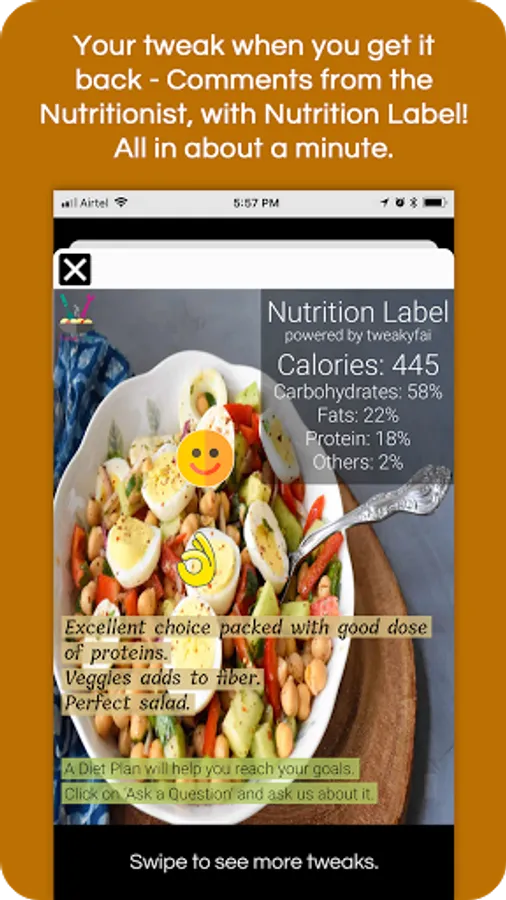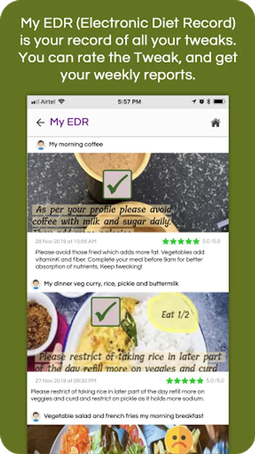 1. Use the app to take a photo of the plate. ‘Tweak it’. Get a tweak of your plate from a certified nutritionist as you are eating