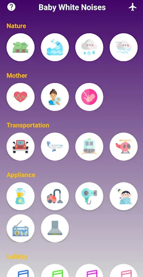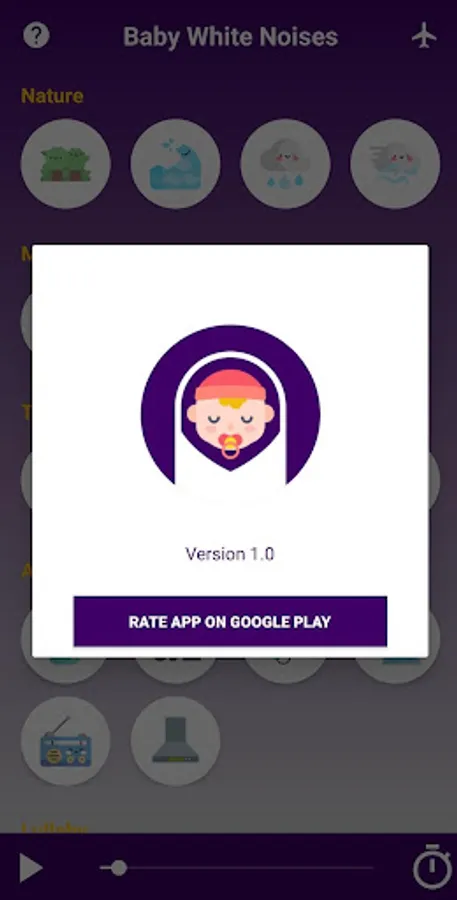 Rapid sleeping of babies is a problem of many parents. Baby White Noises application will help your baby fall asleep, generating monotonous, cyclic sounds such as white noise, vacuum cleaner sound, hair dryer sound, etc. Infants love these sounds because they resemble the sounds they hearing in the womb. Therefore, this type of lullaby is most commonly used by parents to sleeping babies and toddlers.