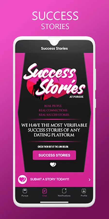 What sets Pursue® apart from the others is our success stories from real people who made real connections through Pursue®. All you have to do is download the app and click on the success stories button within the app to see couples who made a connection at Pursue® or visit our Success Stories page at www.pursuedating.com/successstories.