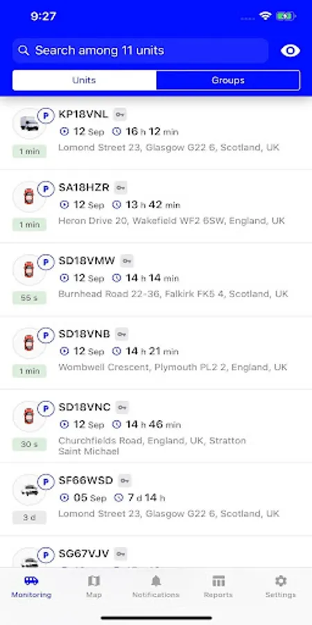 Map mode: Access units, geofences, tracks and event markers on the map with the option to detect your own location.