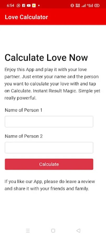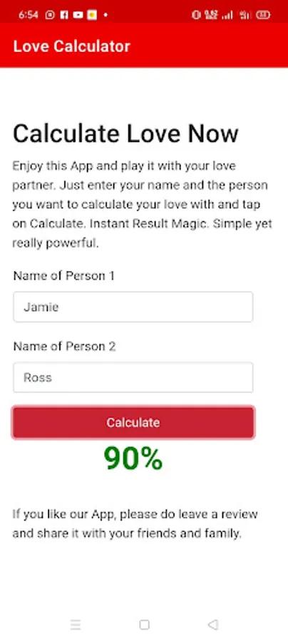 The App is simple yet very powerful. Put in your name and anyone you want to calculate the love with and hit calculate. It will show you a percentage of love between you and them. It's really fun. Check love for as many people as you want. Even celebrities.