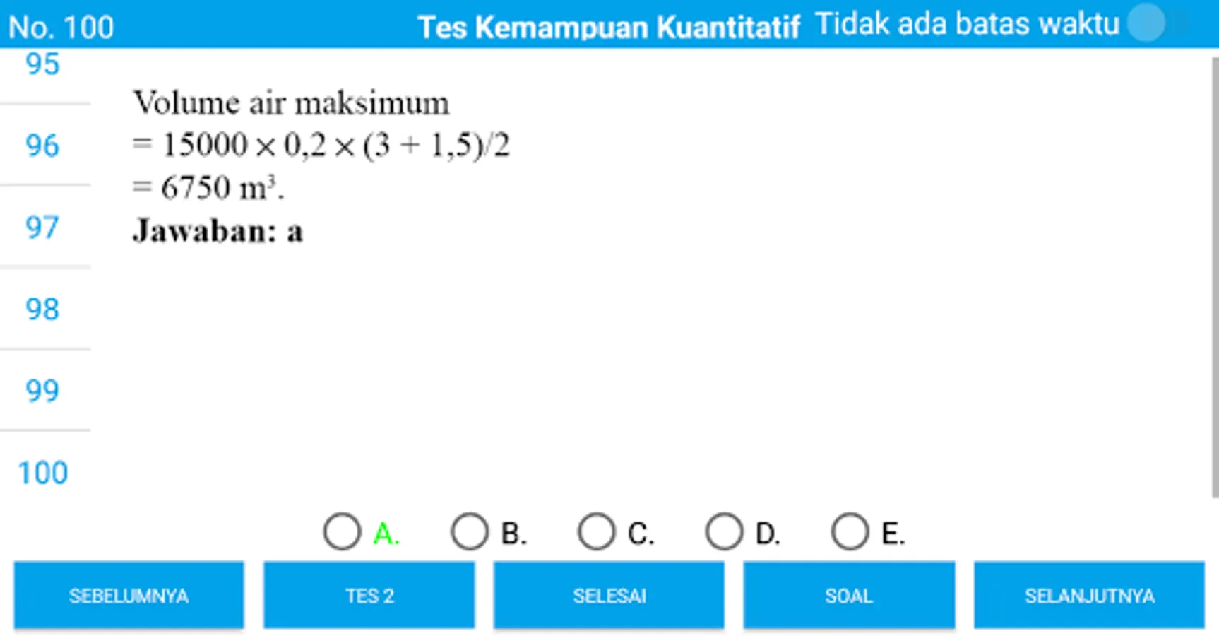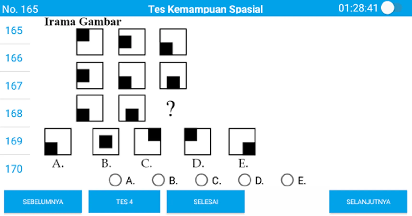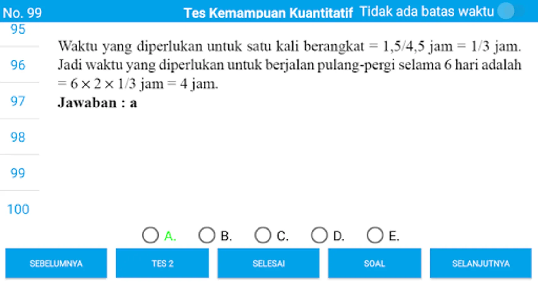 There are four test categories in this simulation, namely Verbal Ability Test, Quantitative Ability Test, Reasoning Ability Test, and Spatial Ability Test. This simulation is equipped with discussion so that it will be easier to learn psychological questions. In addition, the simulation is also equipped with a timer and an automatic score. In this application there are psychological test questions that often come out and how to do them. This application can be used to study before taking a company entrance test, tests to find work in government and private institutions, test to get a scholarship, and so forth.