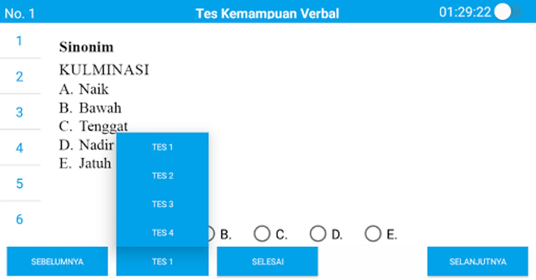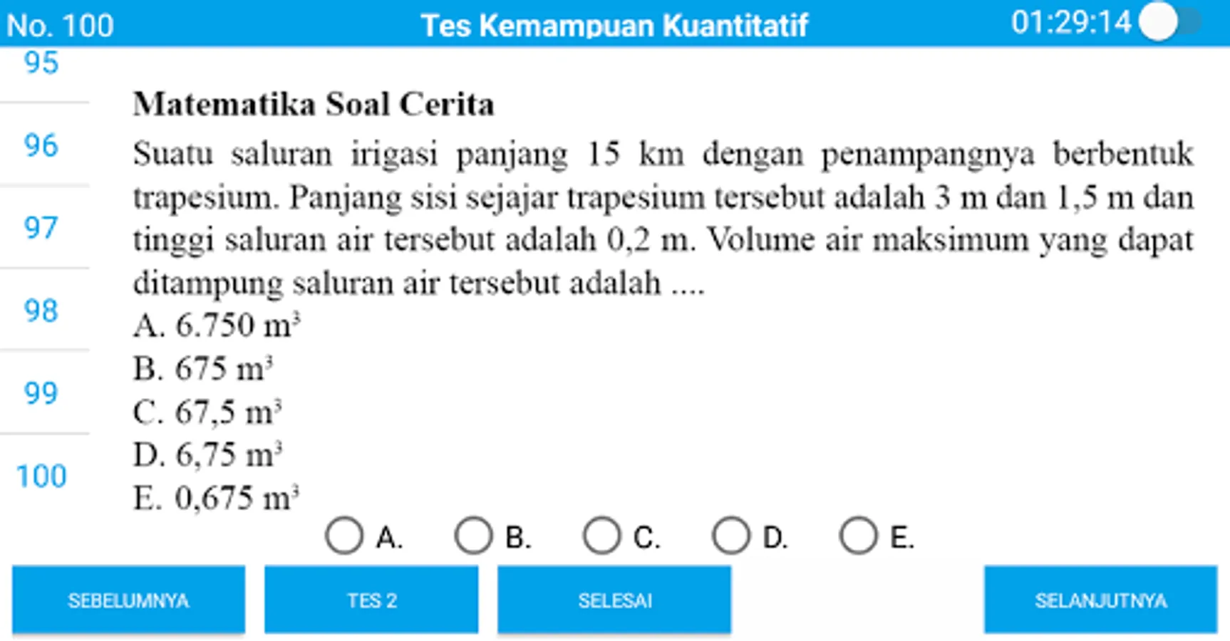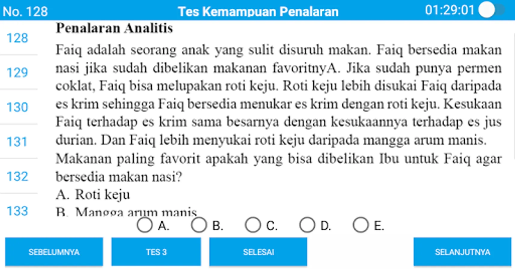 There are four test categories in this simulation, namely Verbal Ability Test, Quantitative Ability Test, Reasoning Ability Test, and Spatial Ability Test. This simulation is equipped with discussion so that it will be easier to learn psychological questions. In addition, the simulation is also equipped with a timer and an automatic score. In this application there are psychological test questions that often come out and how to do them. This application can be used to study before taking a company entrance test, tests to find work in government and private institutions, test to get a scholarship, and so forth.