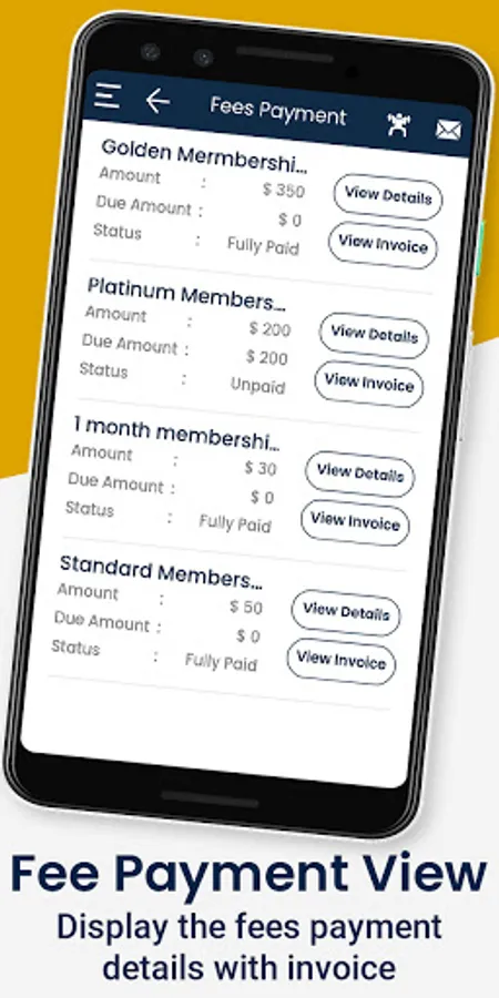 ✔️ Fee Payment View: Display the fee payment details with the invoice.