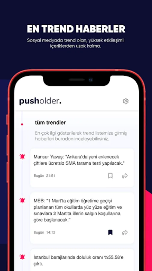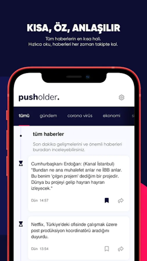 Pusholder is a news application that transmits the last-minute developments in the world and in Turkey directly, without directing you to any site. The most important feature that distinguishes Pusholder, which has many categories such as economy, politics, health, sports, and technology, from other news applications is that it conveys news to its users without advertising and without guidance. You can find the following in the Pusholder application, which always aims to give you 100% performance with its plain appearance, simple and easy-to-use structure;