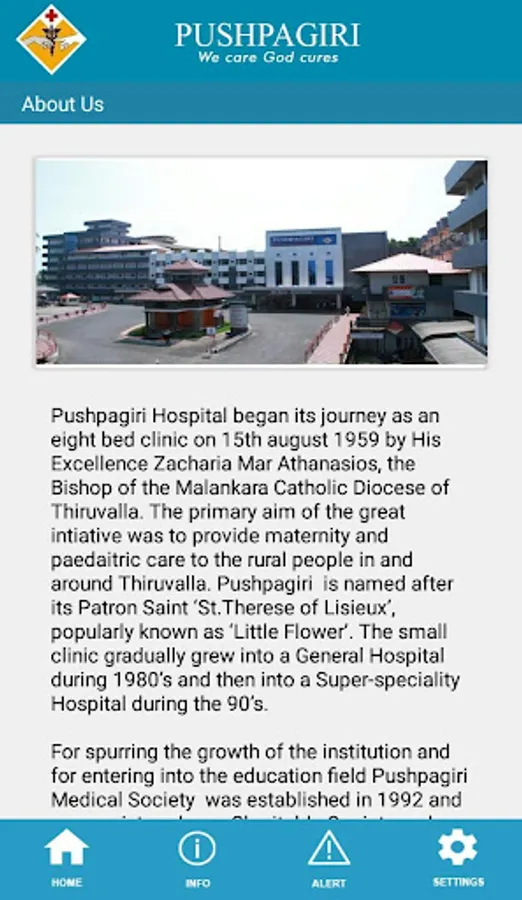 Pushpagiri Hospital began its journey as an eight bed clinic on 15th august 1959 by His Excellence Zacharia Mar Athanasios, the Bishop of the Malankara Catholic Diocese of Thiruvalla. The primary aim of the great intiative was to provide maternity and paedaitric care to the rural people in and around Thiruvalla. Pushpagiri is named after its Patron Saint ‘St.Therese of Lisieux’, popularly known as ‘Little Flower’. The small clinic gradually grew into a General Hospital during 1980’s and then into a Super-speciality Hospital during the 90’s.