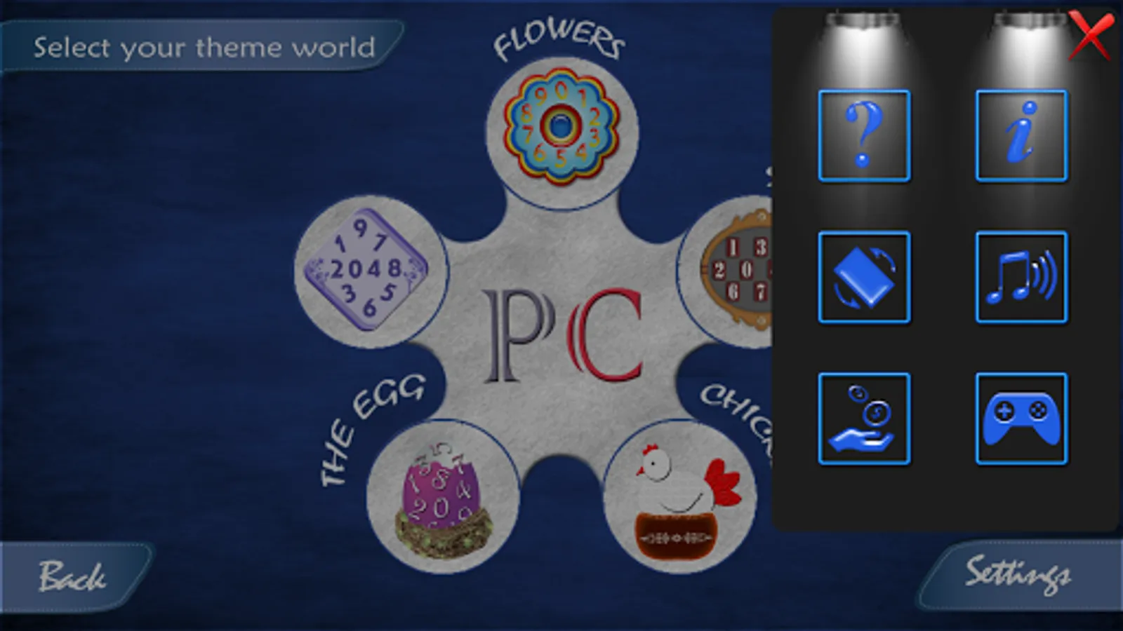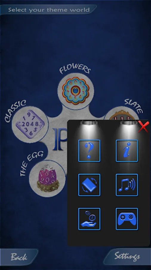 You can set game auto rotation, sounds, music, different levels and colourful themes within settings.