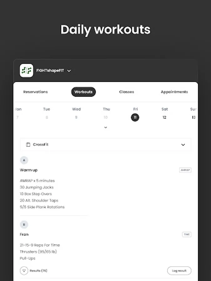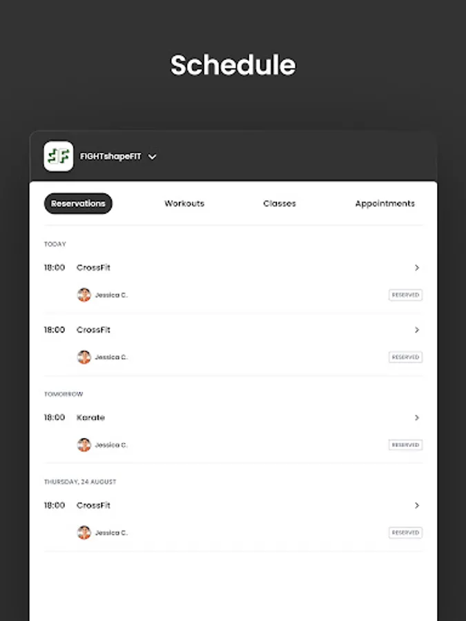 For members of FIGHTshapeFIT to reserve their place in a class, sign up for gym events, and general account management like updating headshots and credit card on file.