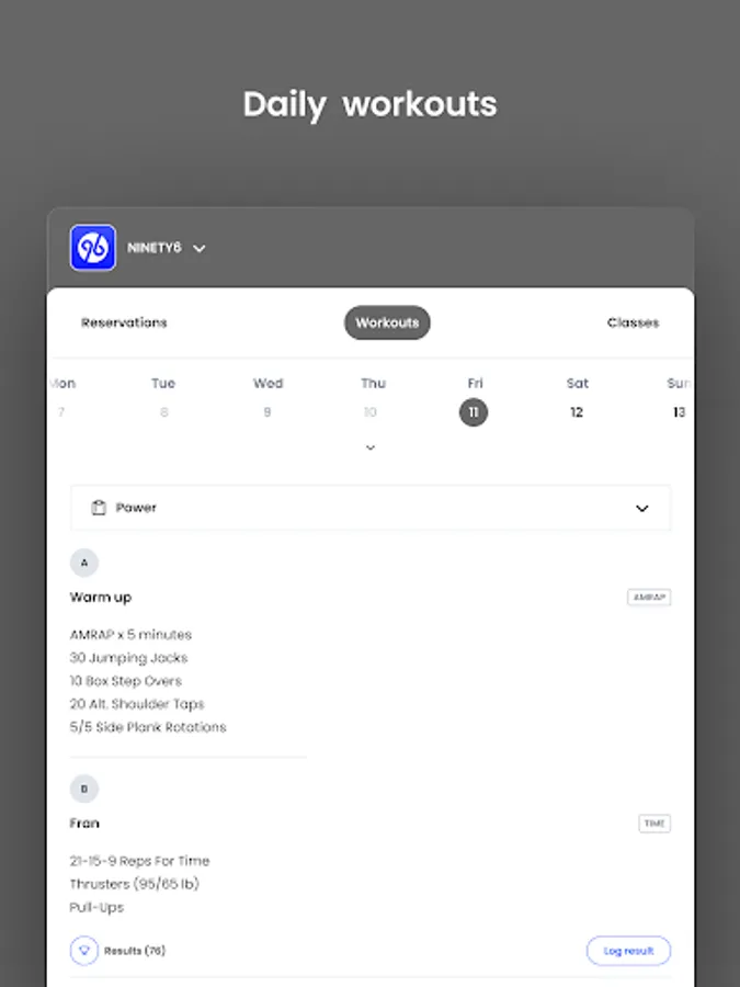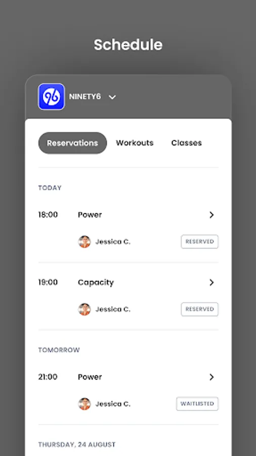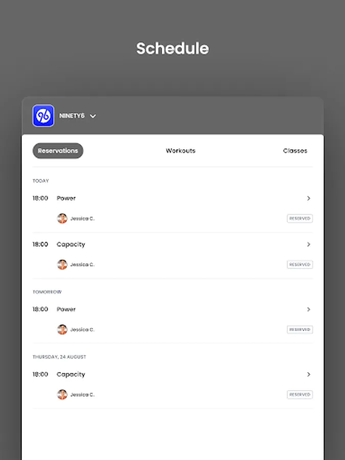 For members of NINETY6 to reserve their place in a class, sign up for gym events, and general account management like updating headshots and credit card on file.
