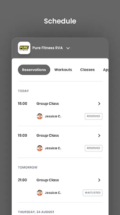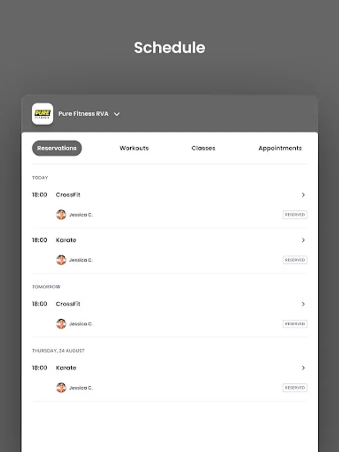 For members of Pure Fitness RVA to reserve their place in a class, sign up for gym events, and general account management like updating headshots and credit card on file.