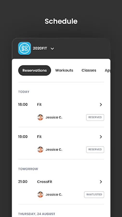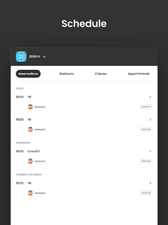 For members of 2020FIT to reserve their place in a class, sign up for gym events, and general account management like updating headshots and credit card on file.