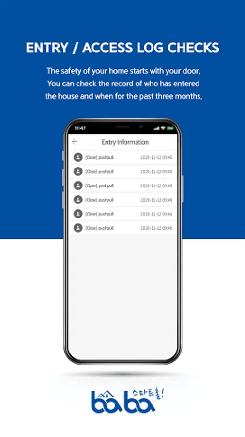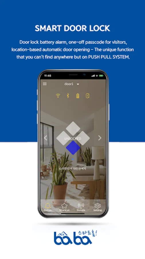 "Pushpullbaba" is smart phone application for managing BABA door lock. Use "Pushpullbaba" mobile application for more convenient and secure door lock management.