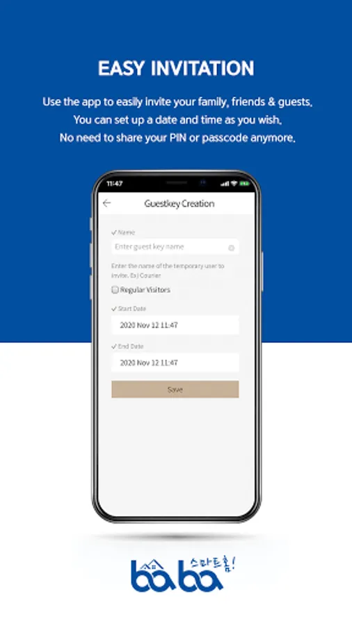 - Through the app, you can set the time period for guests or set a one-time guest password for a temporary visitor. The user can enter and use the authentication number issued without registration.