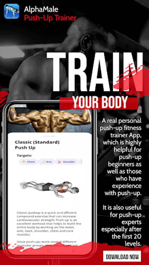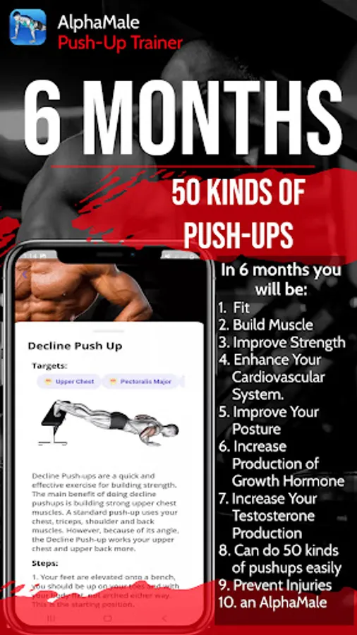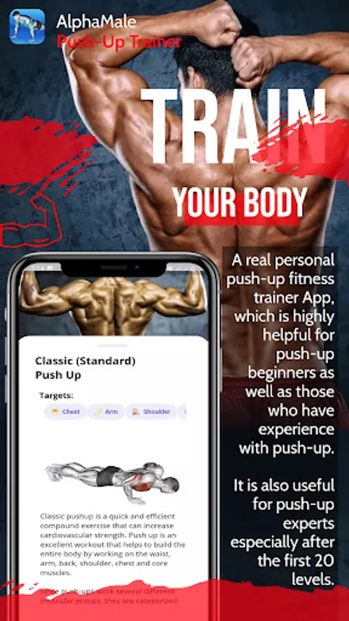 This app 💪 is designed to target multiple muscle groups including chest, biceps, shoulders, triceps, back, abs, forearm and legs. The App is a result of extensive research on the range of push-up exercises and their degree of difficulty, created by a team of coaches, trainers, push-up experts, UI/UX designers and developers. Alpha Male is not only a personal pushup coach, but also a bodyweight exercise, calisthenics, and upper body workout app that will help you achieve your fitness goals.