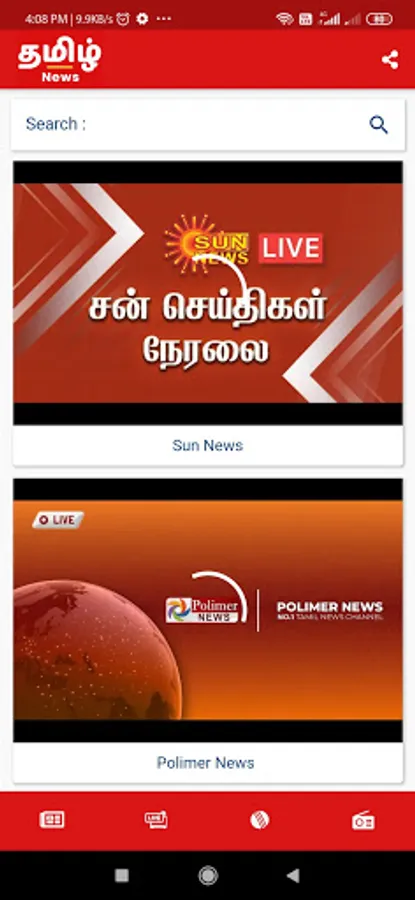 Thanthi TV, Puthiya Thalaimurai tv, Polimer News, News 7 Tamil, News 18 Tamil, Kalaignar Seithigal, Jaya Plus, NewsJ Live, Makkal Kural TV, Malai Murasu TV, Captain News, velicham tv, Cauvery News, Lotus News, Sathiyam News, Vasanth Tv, Madhimugam Tv, Vendhar Tv, DD Pothigai, DD News LIVE (24x7)