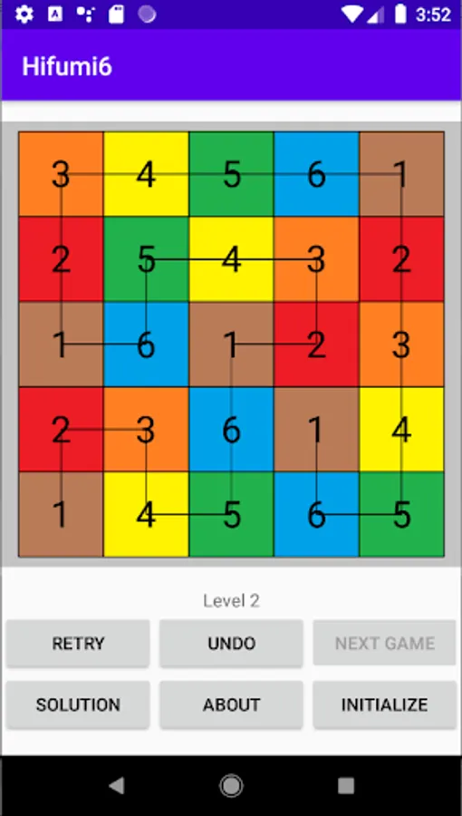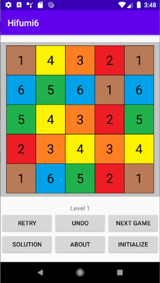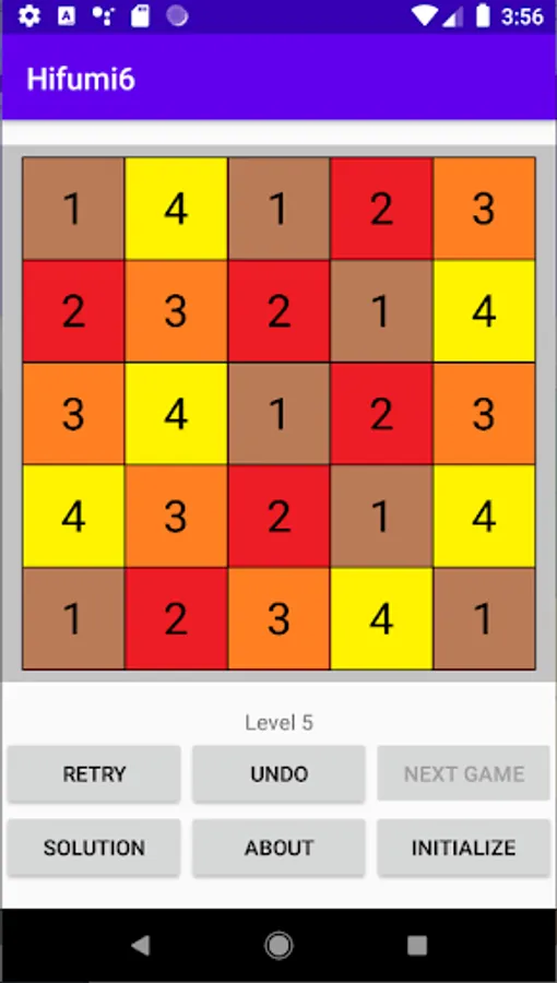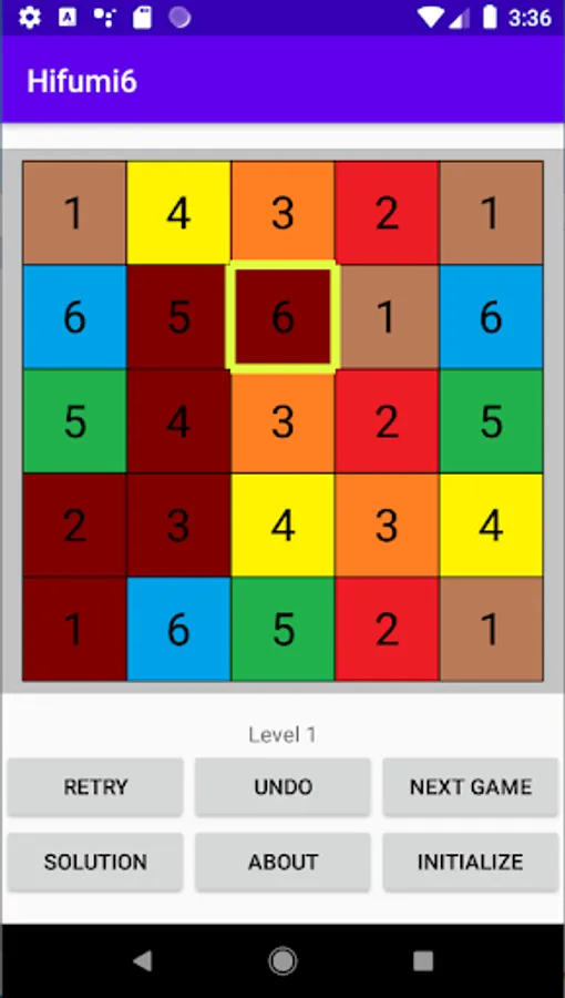 The objective of this brain teaser "Hifumi Puzzle" is to find a way to visit all 25 tiles by clicking neighboring tiles in the order 1, 2, 3, 4, 5, 6, 1... without getting stuck.