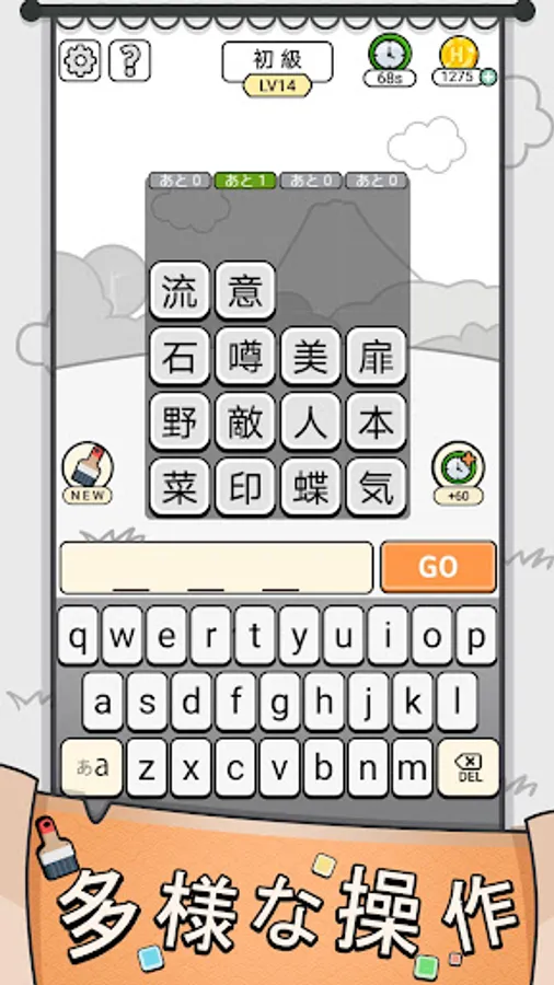 - Simple controls: Tap kanji blocks to form words, input readings, tap "Go" to clear blocks. Easy to grasp rules learned in minutes to win crossword puzzles.