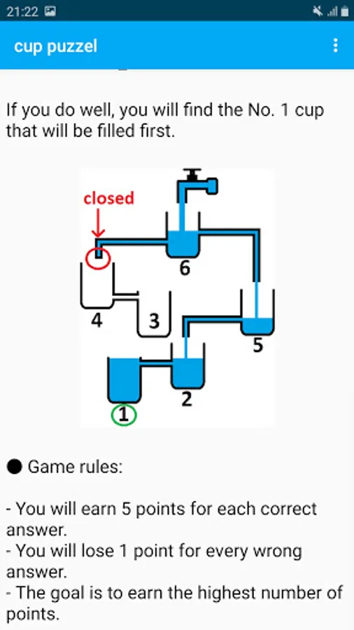 In each level you will find many questions that are a puzzle and the question will be: "What is the cup that will fill first?" There are choices and you choose the correct answer.