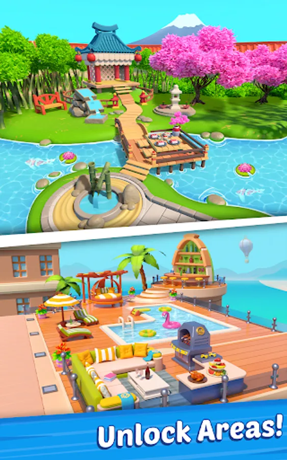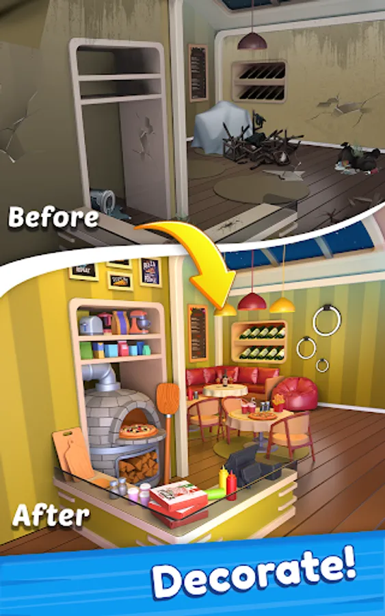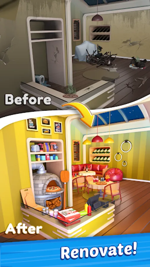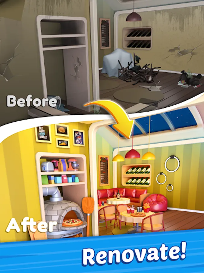 Design & Renovate: Create your unique home design & restaurant designs. Apart from restaurants, Merge and decor Mansion and Inn! Travel town and merge food items.
