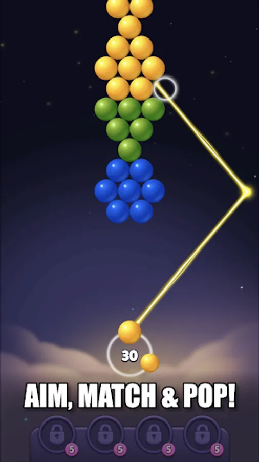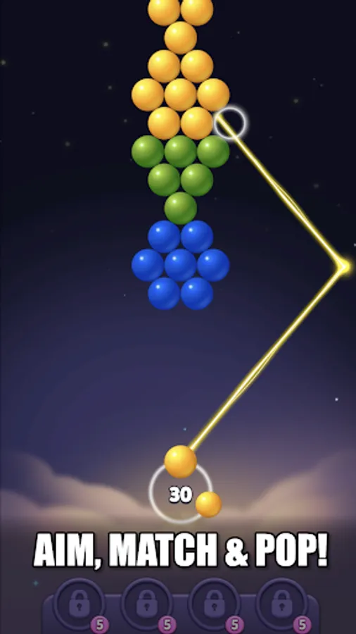 Embark on a starry night filled with shooting stars, rockets, hot air balloons, and so much more! Take aim, shoot, and pop your way through the puzzle adventure. Clear the board with fewer shots to receive a higher score at each level! Put your bubble-bursting skills to the test and blast your way to the top!