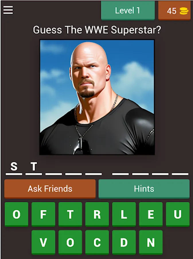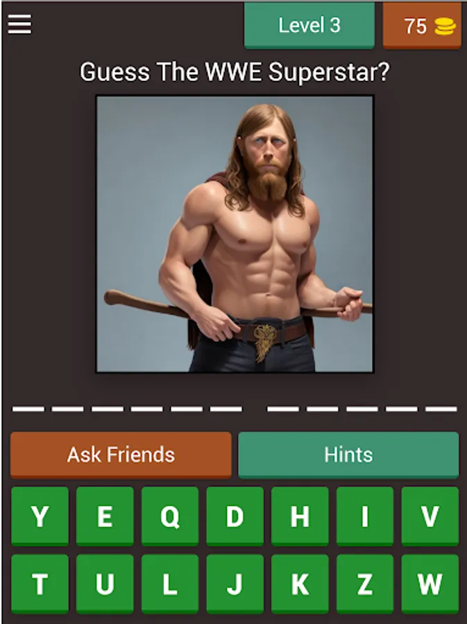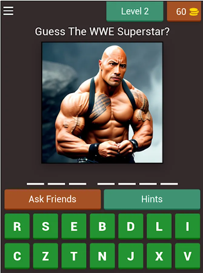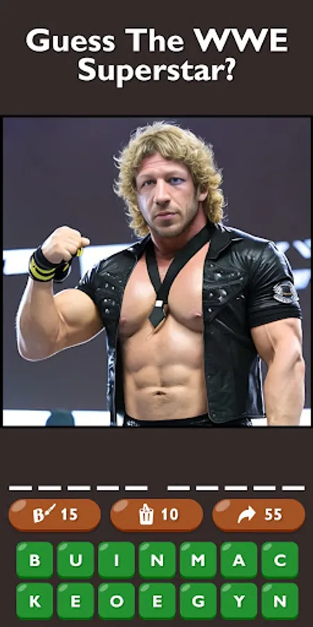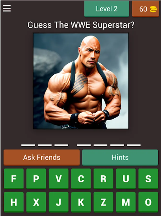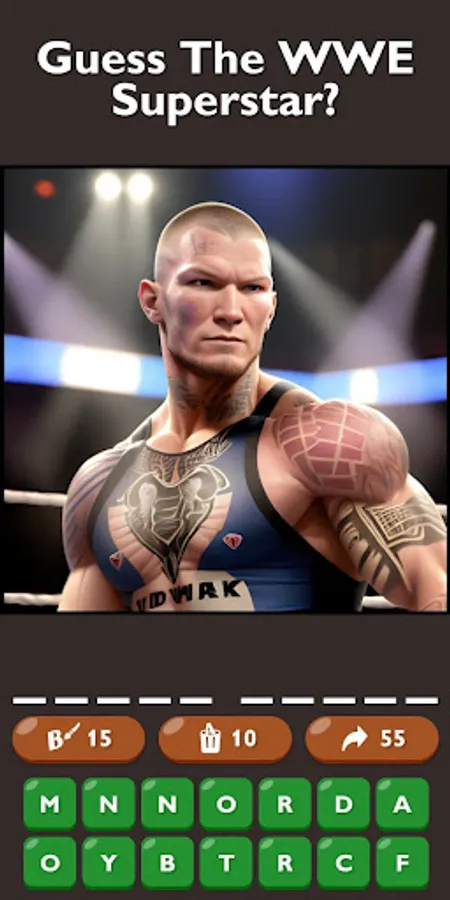 - You will see a photo of a WWE superstar on the screen. Tap on the letters below to spell out their name. If you get stuck, you can use hints or ask your friends for help.