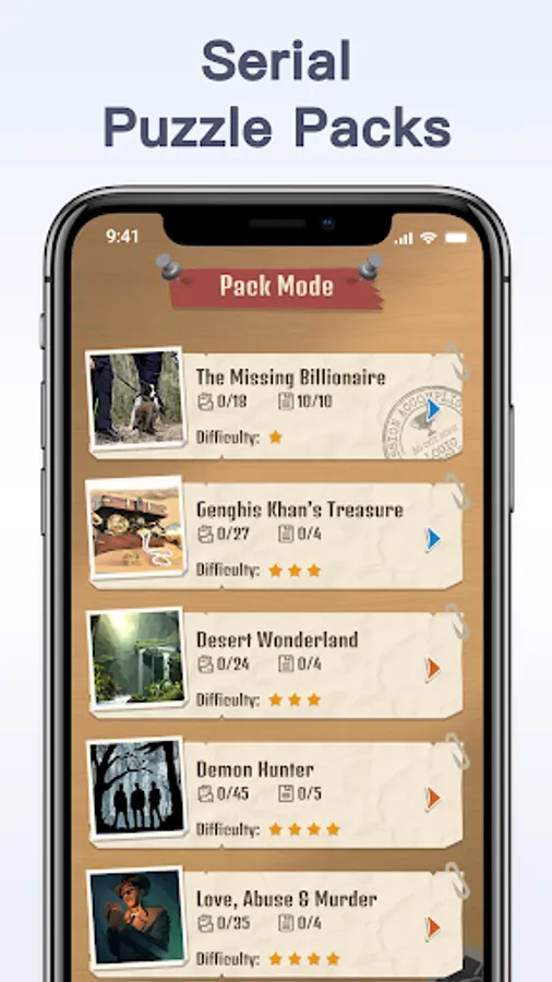 The Pack Mode is an original game mode. Each pack contains dozens of consecutive puzzles. As you solve each puzzle, you'll immerse yourself in a story and feel like a detective uncovering clues.