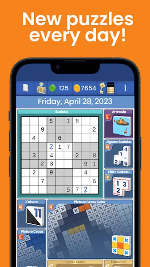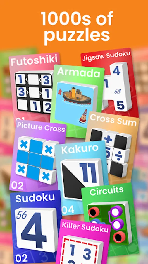 Puzzle Page Logic includes classic brain teasers like Sudoku, Nonogram, and Kakuro with new puzzle types added regularly.