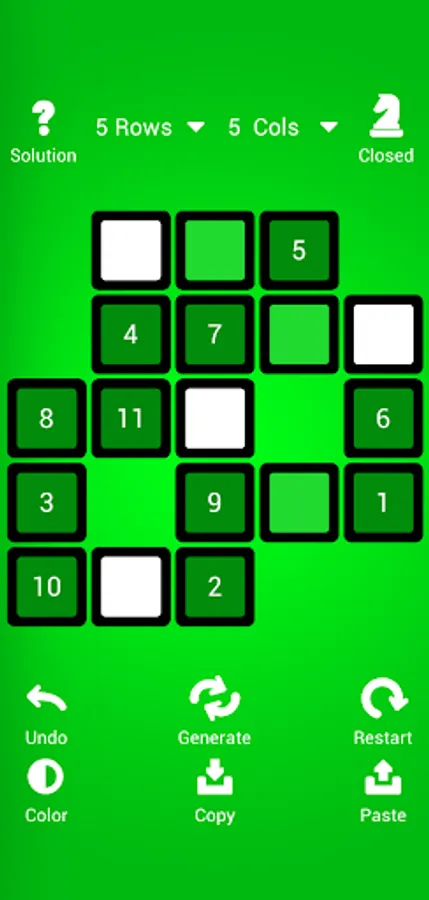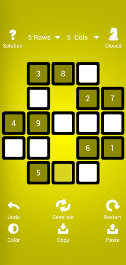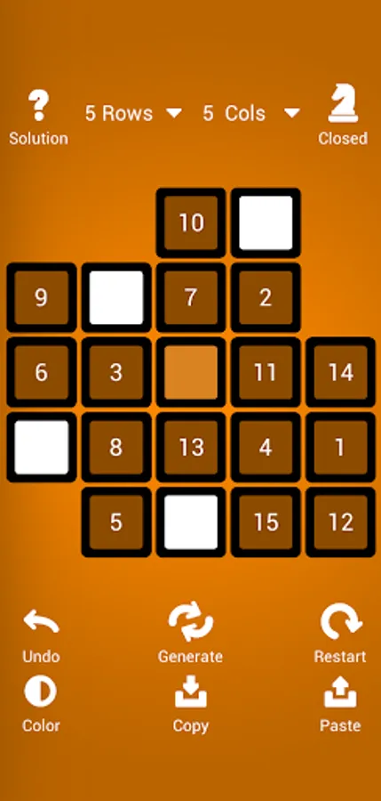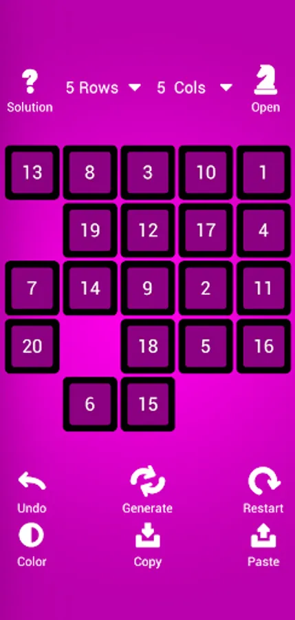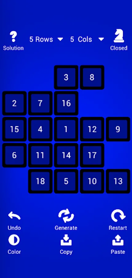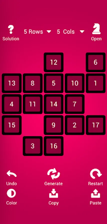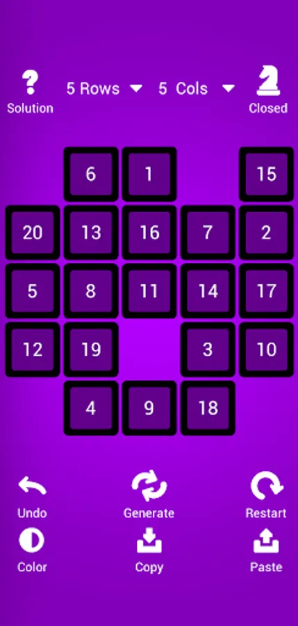 You are the knight. All you must do is visit each square on the board exactly once following the traditional moves for a knight piece in chess . The board size is adjustable (3x3, 3x4, 3x5, 3x6, 3x7, 3x8, 4x3, 4x4, 4x5, 4x6, 4x7, 4x8, 5x3, 5x4, 5x5, 5x6, 5x7, 5x8, 6x3, 6x4, 6x5, 6x6, 6x7, 6x8, 7x3, 7x4, 7x5, 7x6, 7x7, 7x8, 8x3, 8x4, 8x5, 8x6, 8x7, and 8x8) and is randomly generated. In order to win in open tour mode, you must visit every square on the board exactly once. In order to win in closed tour mode, you must visit every square on the board exactly once AND the last square you visit must be one L move away from the square you started with.