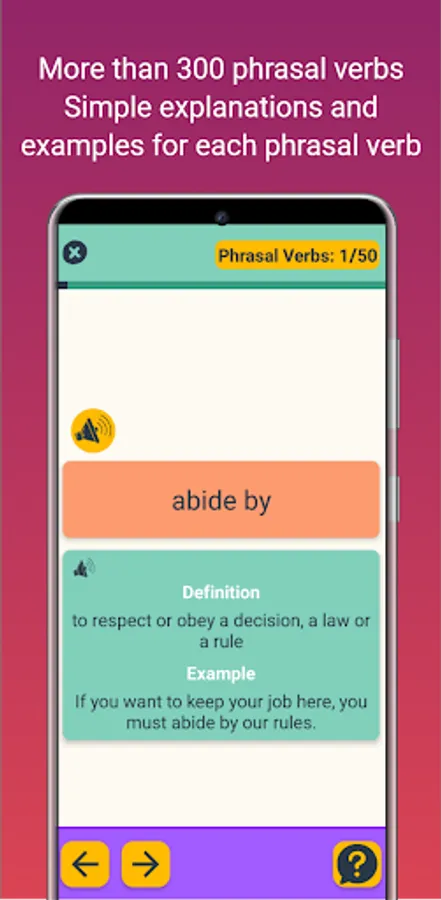 But at the same time, such a big number doesn't mean that all of these phrasal verbs are of common operation. The maturity of them just rest inside the vocabulary. Native speakers know them, but they hardly use them in everyday speech. Our application will save you from this chaos and present you with the most used phrasal verbs. So you will learn these complex words in an easy and fun way!