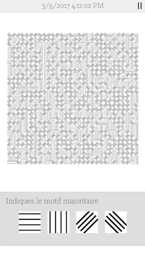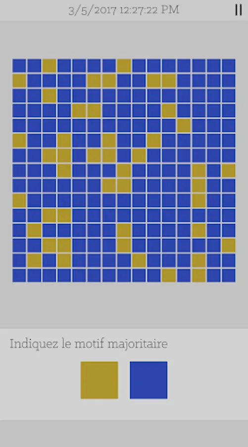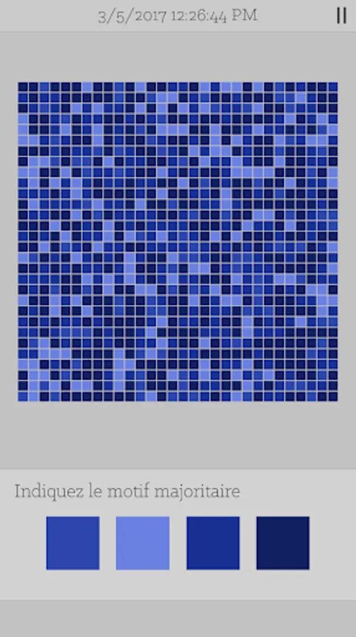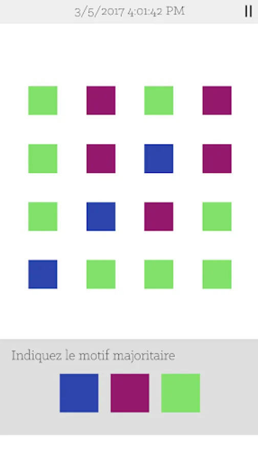 The game features levels containing color grids and / or randomly generated patterns. You must discern the pattern or color majority within the grid.