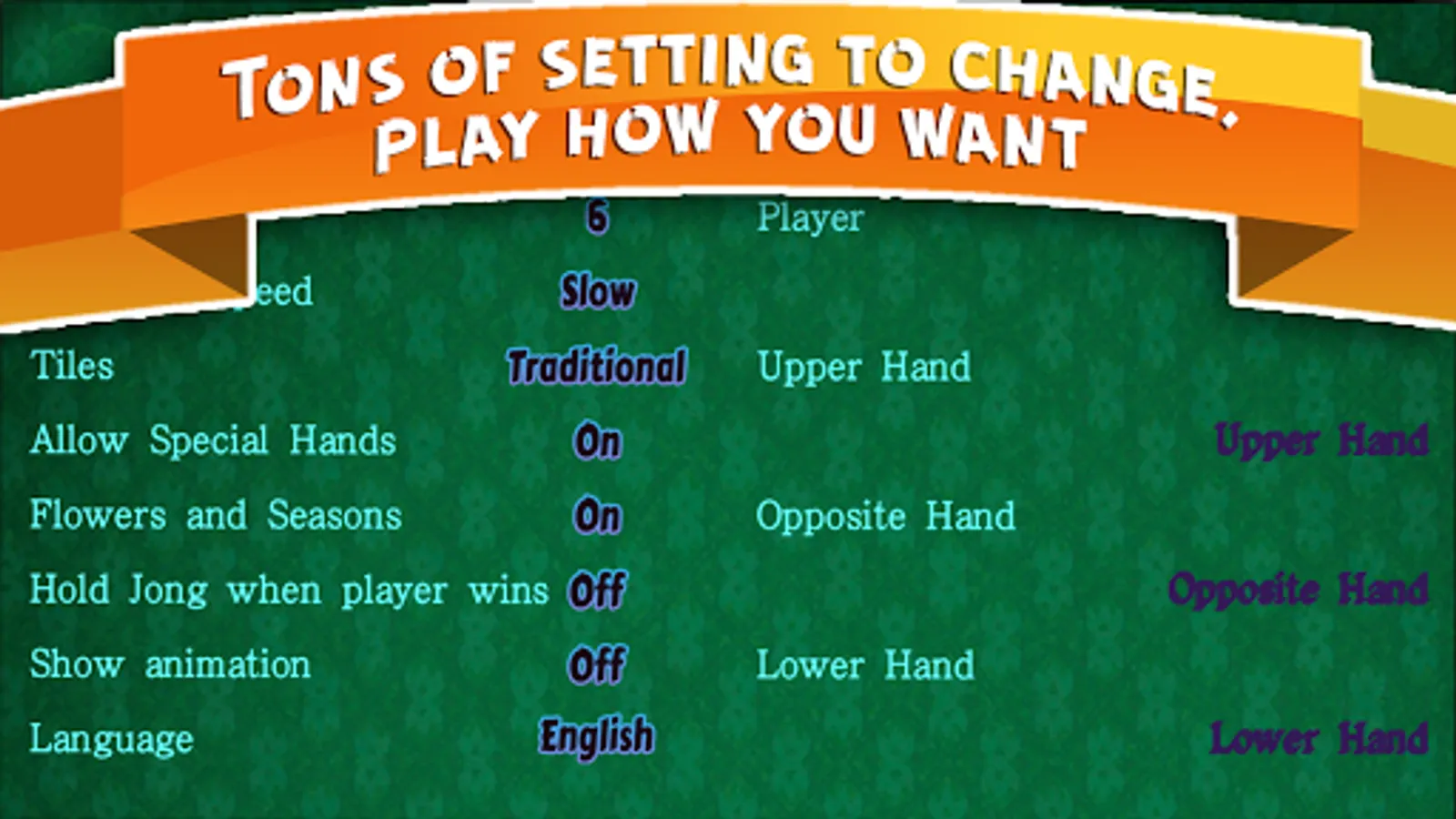 Be prepared for fast paced Mahjong action, incorporating traditional Hong Kong rules with many options to customise your playing experience, including: