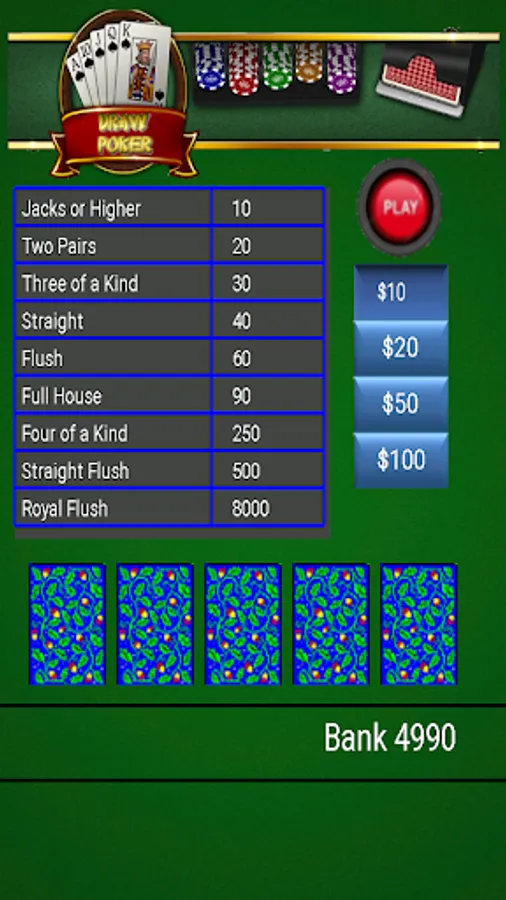 Casino Video Poker style Five Card Draw Poker game. Basic Poker game where you are given 5 cards, you select which ones to discard and you are given new cards. A payout table determines your winnings. I hope you enjoy the game.