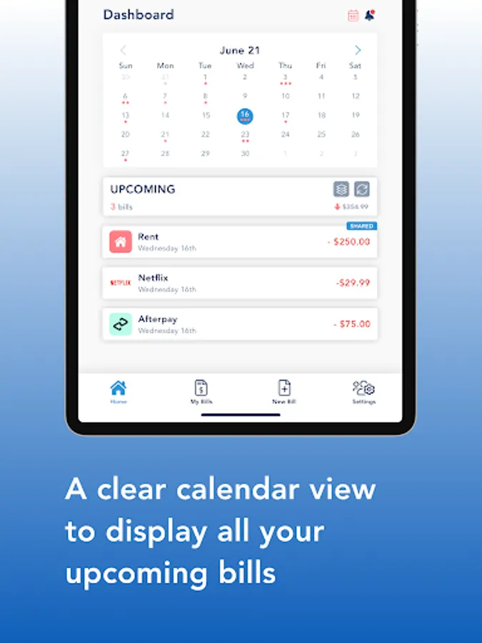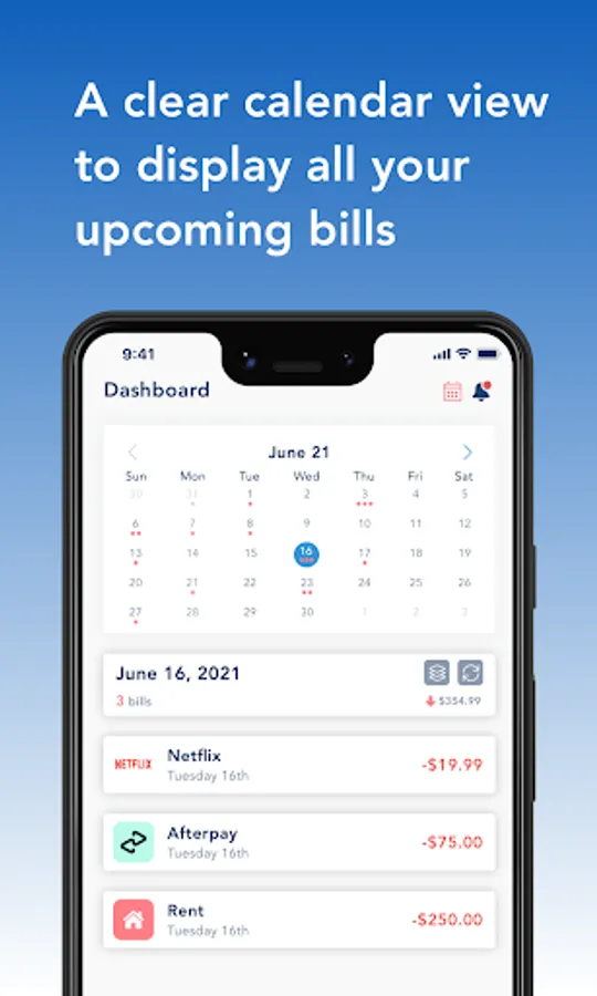 See all your upcoming bills in a beautiful calendar view.