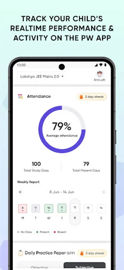 Monitor Your Child’s Progress - View their attendance, lecture, DPP, and test stats on the student dashboard. See how they are performing in their respective batches and courses.