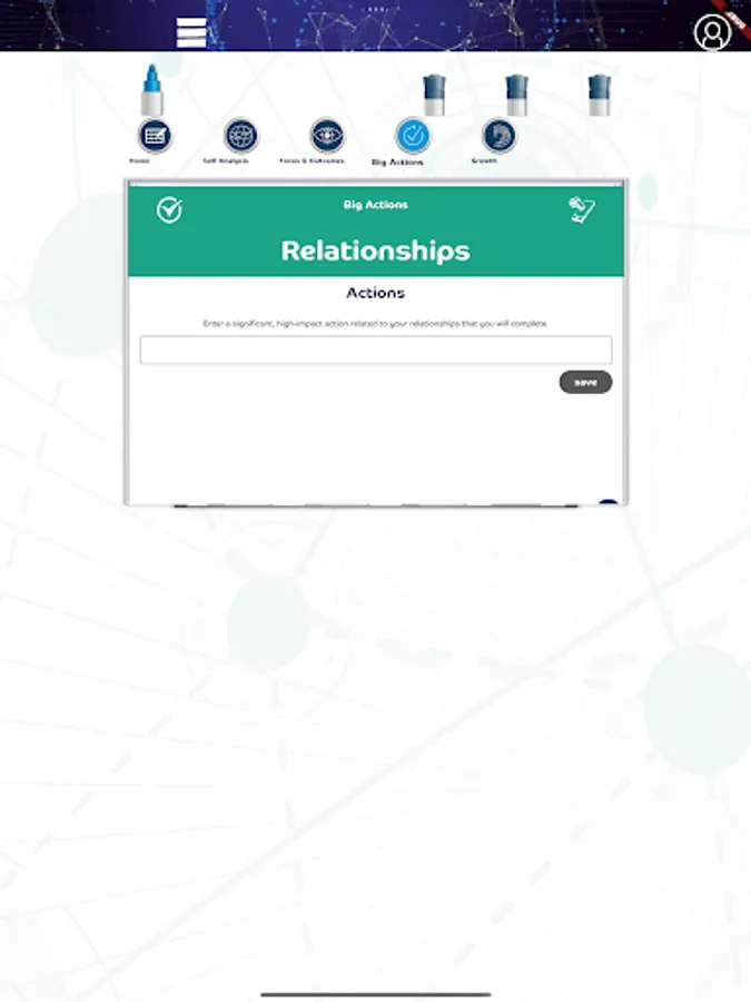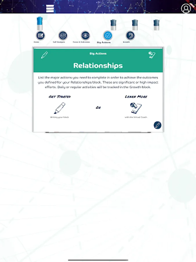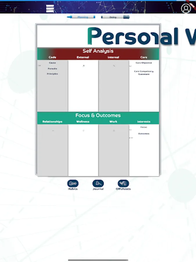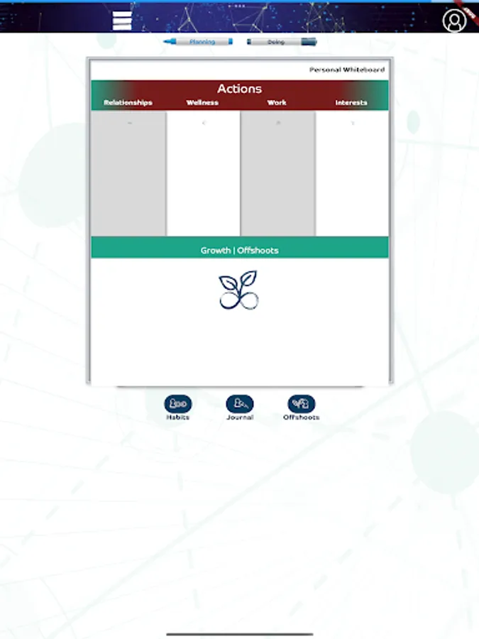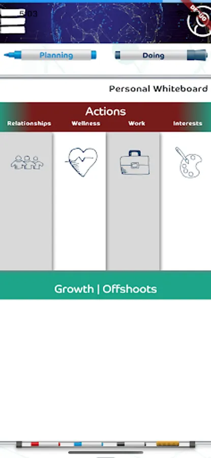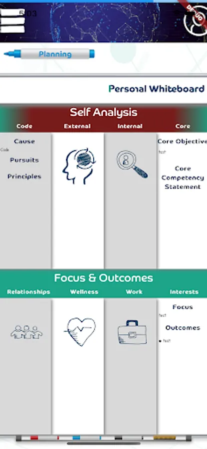 The Personal Whiteboard is a tool that helps you look at yourself and your life comprehensively, then take initiative to align your actions with the outcomes you desire. Think of it as a north star that keeps you on your intended course as you navigate life. This app guides you through a process for self-analysis, defining focus and outcomes, planning actions, and personal growth. It contains a library of videos for each block in the Personal Whiteboard that provide detailed overviews, examples, and context.