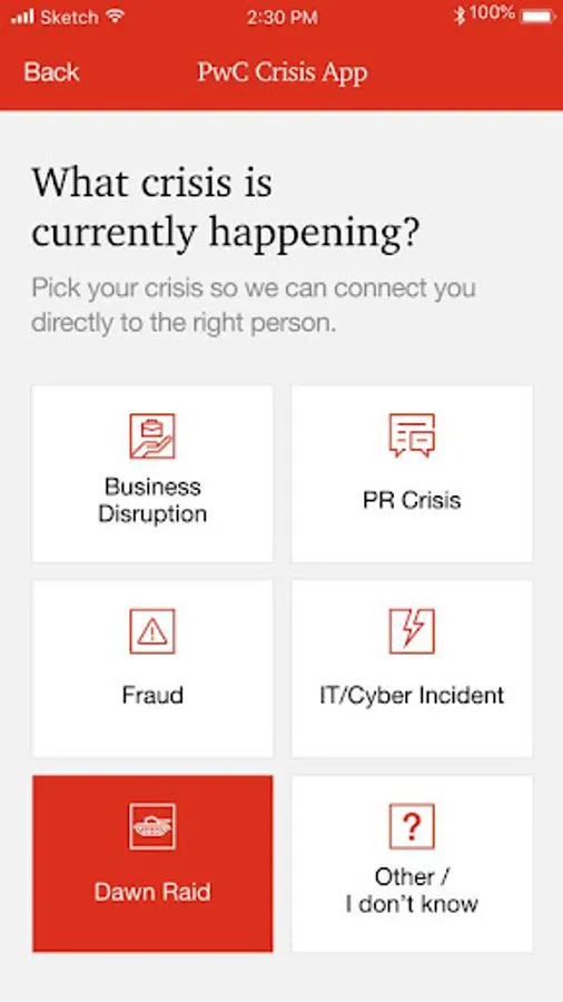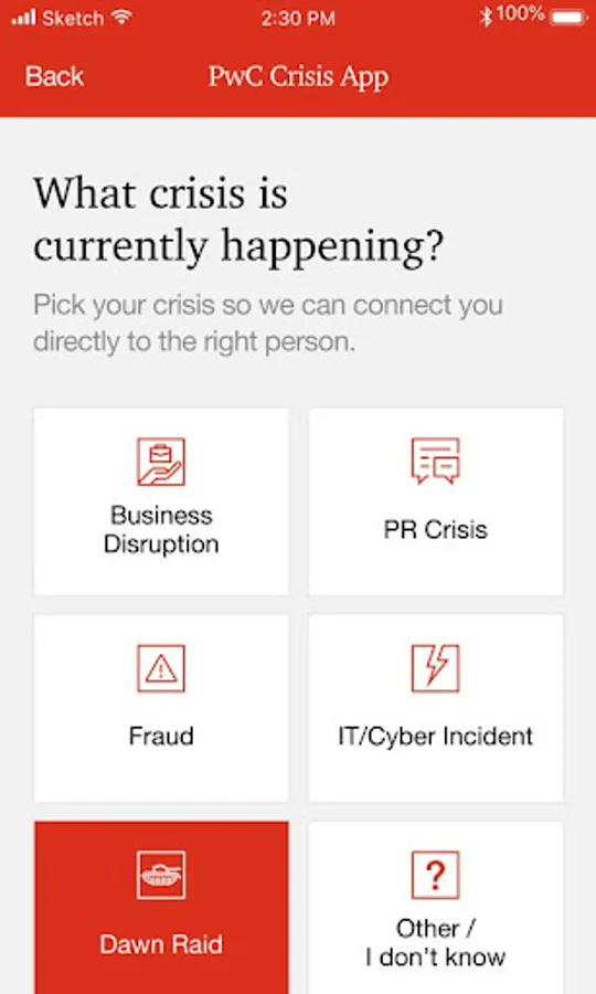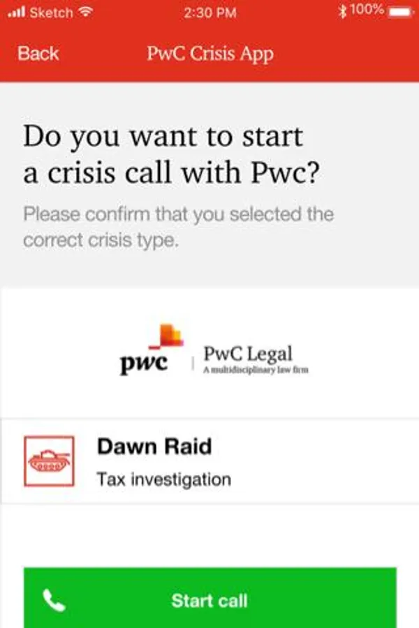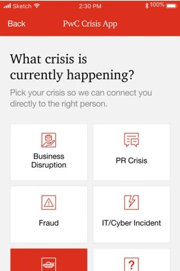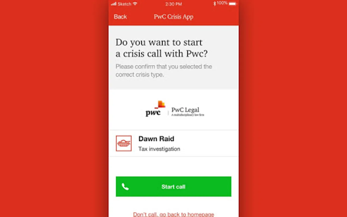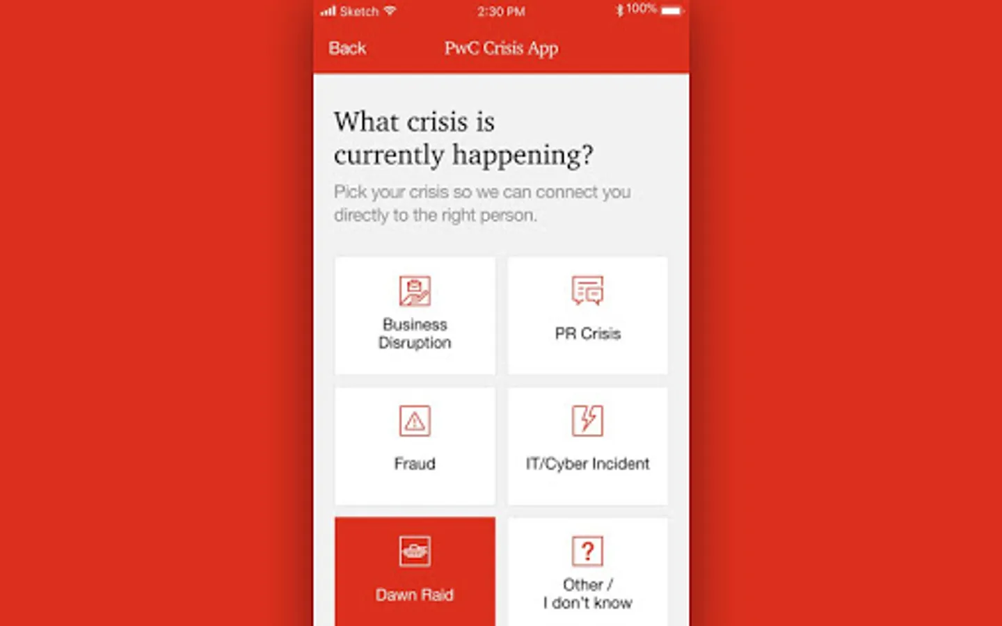 The PwC Crisis App is a solution that supports our Crisis Response Services. Through this app users have access to a crisis hotline, crisis guidelines, SMS notification and a virtual meeting room. This requires a subscription contract.