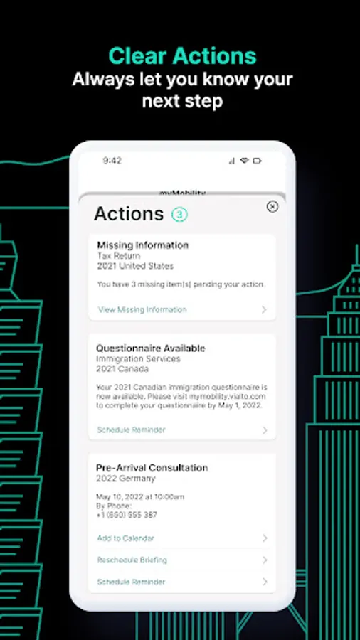 Gain peace of mind with real-time actions and transparent updates on the status of your services. Easily book consultations, provide any additional information requested by your Vialto team, and schedule reminders for key dates. You’ll always know your next step and where your services stand.