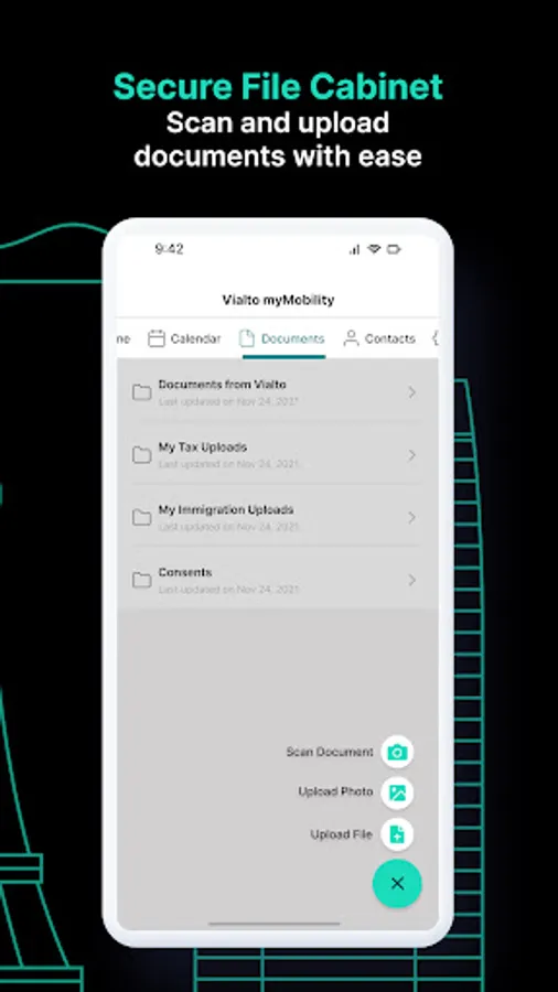 Share your documents via our Secure File Cabinet. Directly upload photos or documents already on your mobile device or scan and share with your Vialto Partners team.