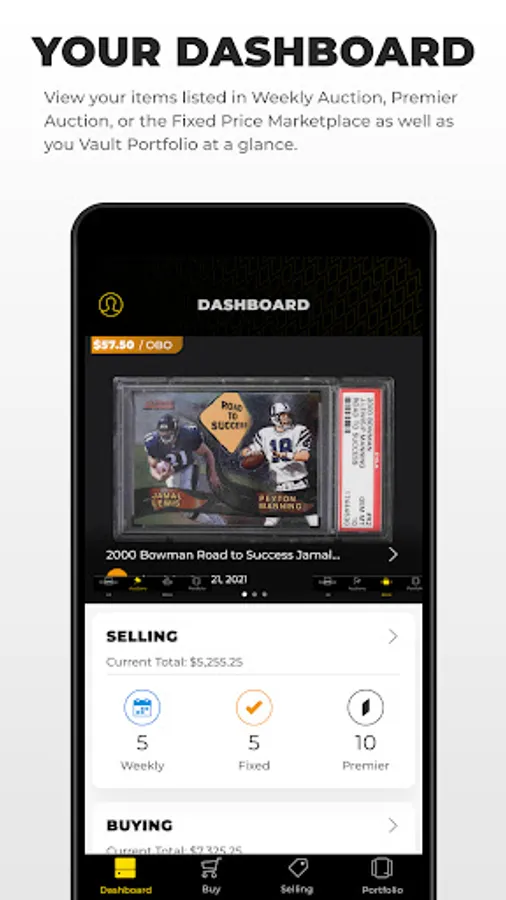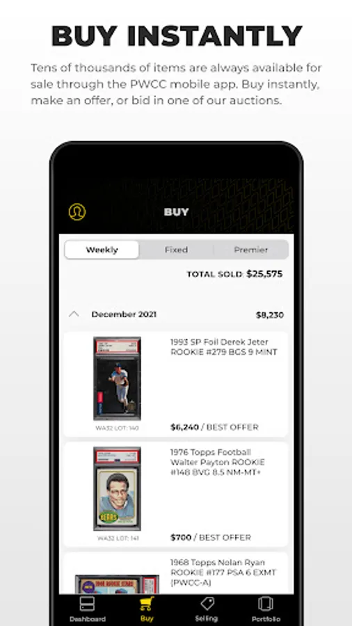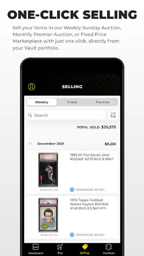 Users can easily sell their cards through our curated Weekly Auctions, our high-end Premier Auctions, or as a fixed price with the ability to accept offers on our Fixed Price Marketplace.