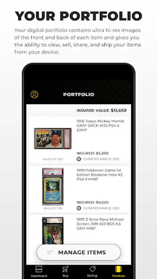 View your entire portfolio on your phone. All cards are listed in a fun and straightforward interface, including insured values for each card and a stated value of your entire vault portfolio.