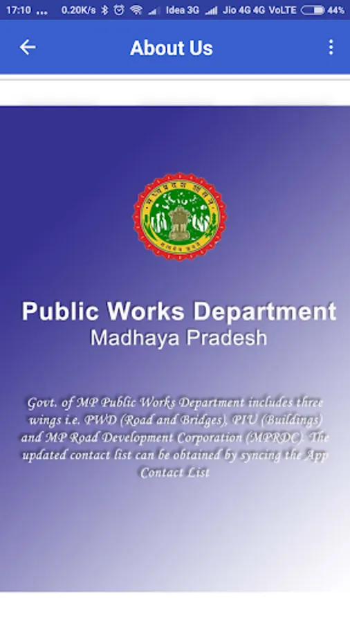 PWD Contacts Application has been developed for the Officers and Employees of PWD (Roads & Bridges) , PIU (Buildings) and MPRDC depart for official use only. Only mentioned departments officers and Employees are are authorized to use this application. The authorized person shall be verified by OTP sent to registered mobile number.